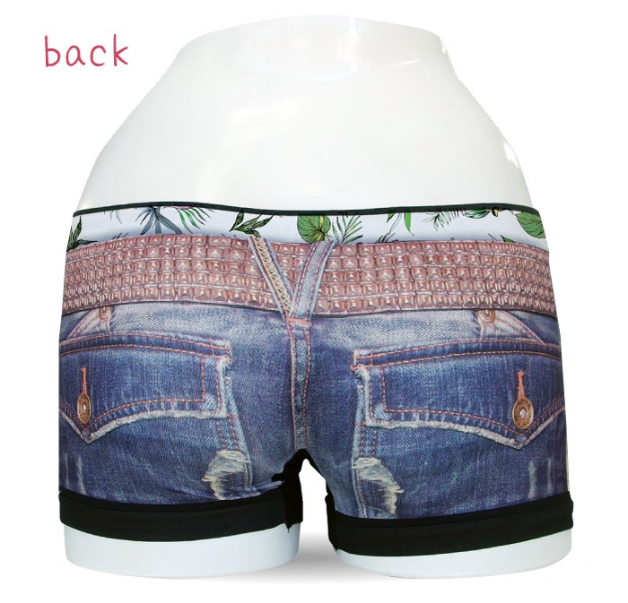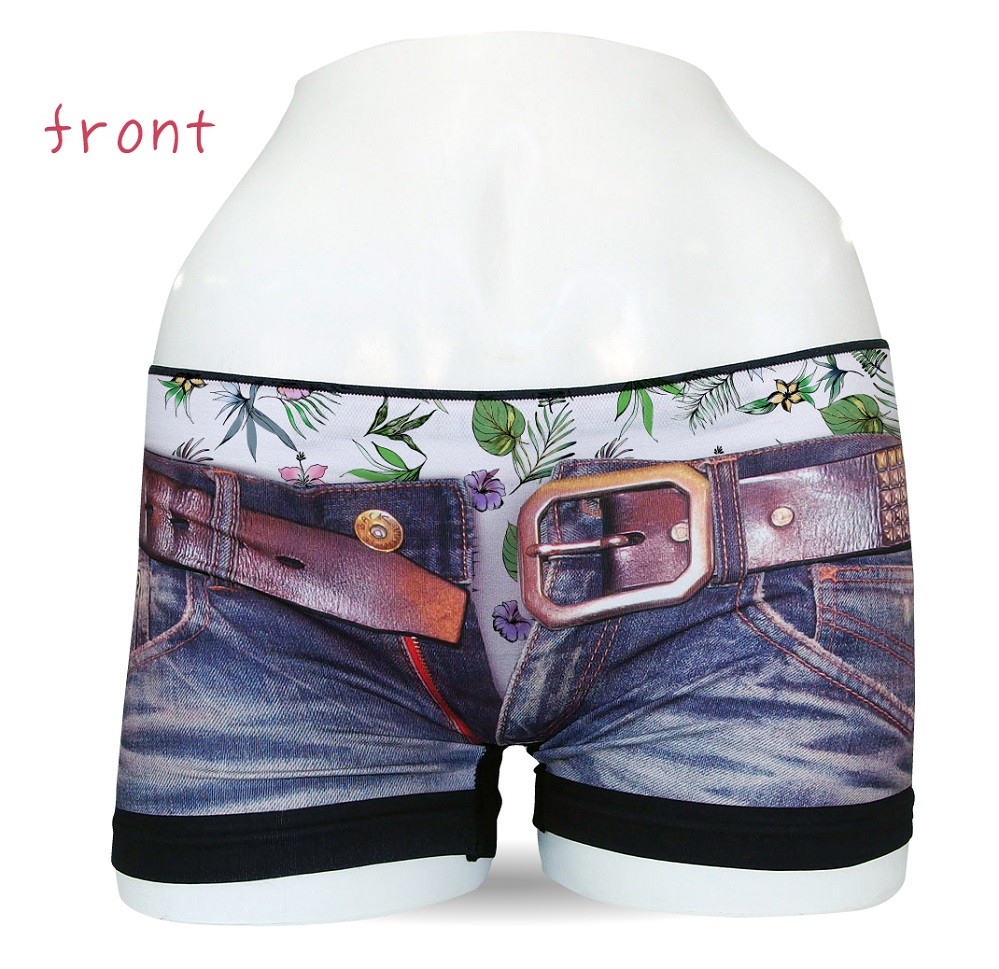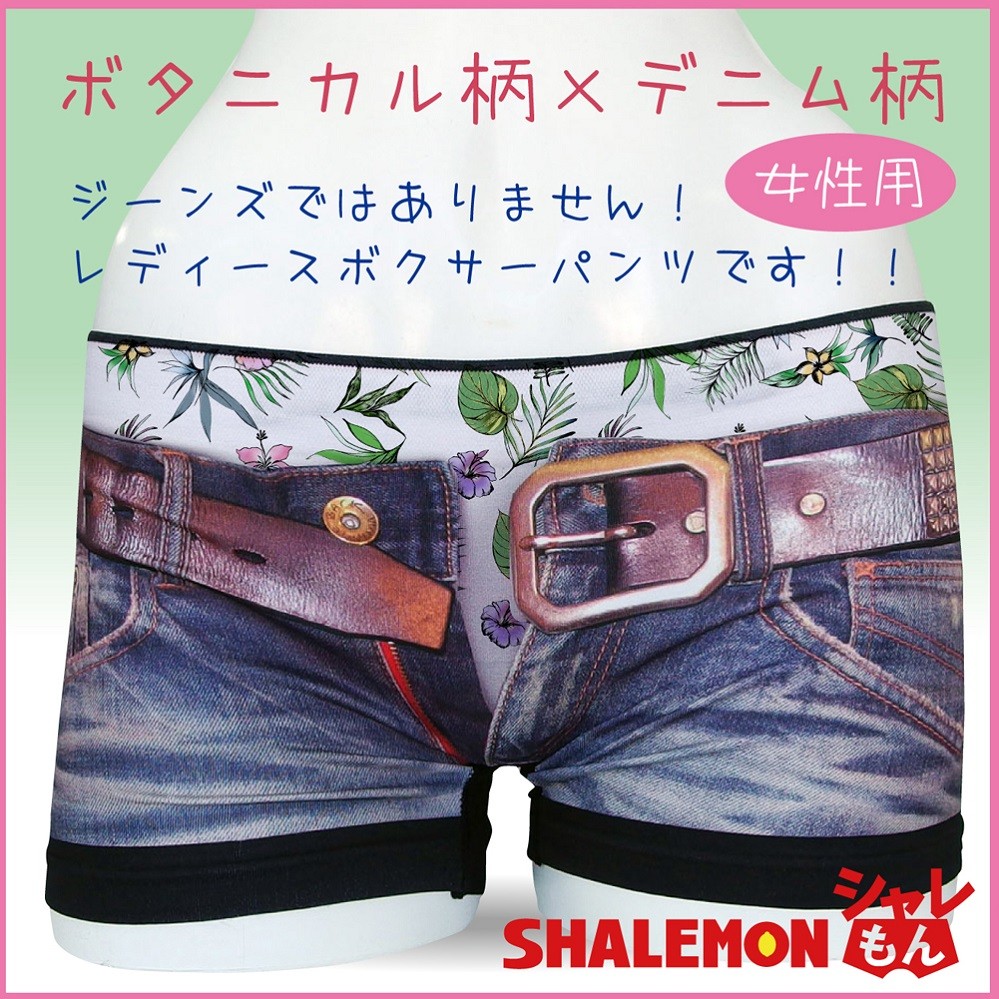 見せパンを見せる!?本物そっくりのデニムプリントからボタニカル柄のパンツを見せパンしたデザインの女性用ボクサーパンツです。柔らかな履き心地が自慢の高伸縮素材のシームレスタイプは、女性用フリーサイズなのでサイズの心配も少ないからオススメです。