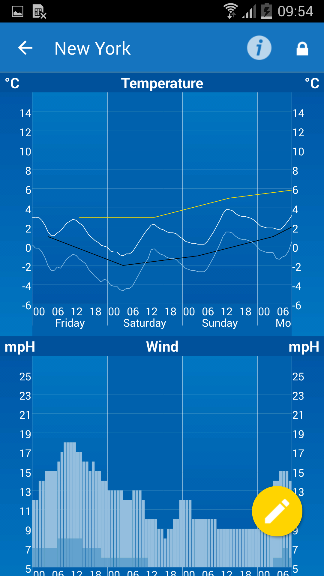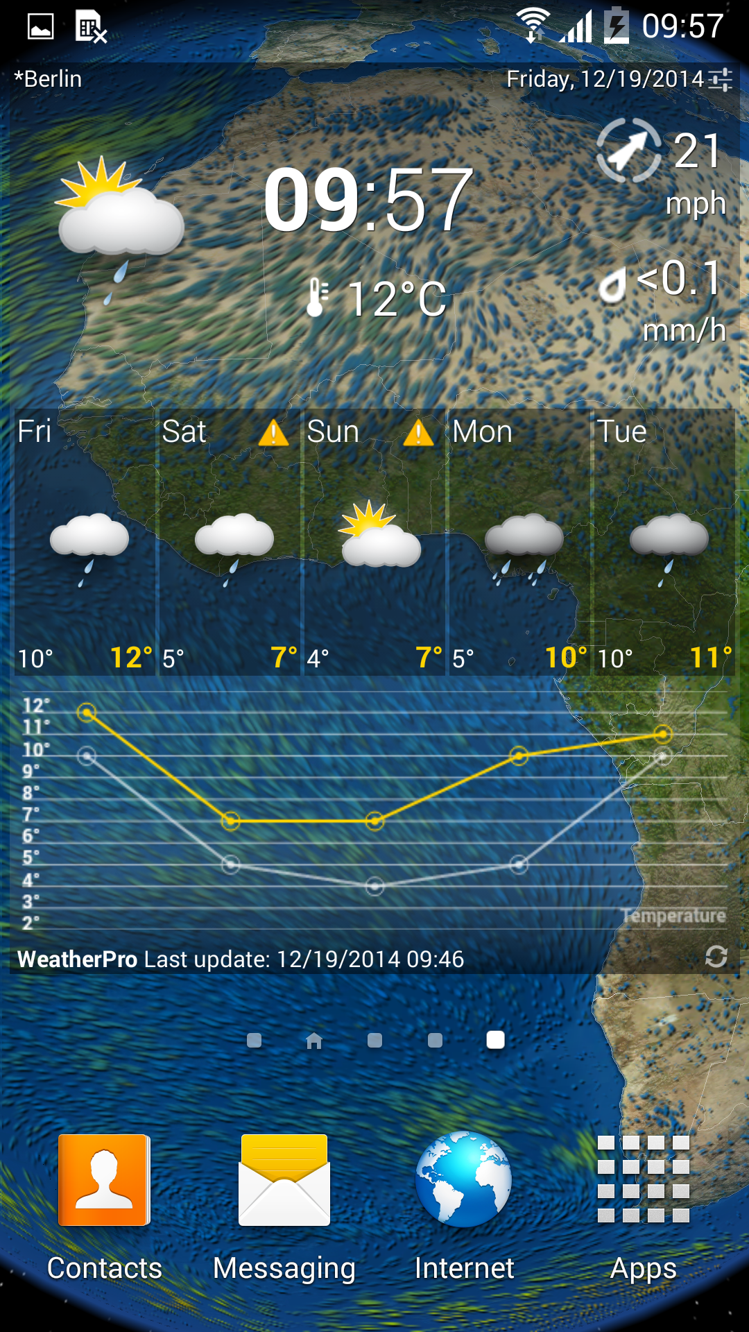 - Feature : 3-hourly forecasts for the week ahead including temperature, wind direction and speed, air pressure, precipitation amount and probability and relative humidity / View forecast as a graph for an alternative, easy to read outlook / Worldwide alerts and warning levels for extreme weather / Global satellite and animated radar for the USA, Australia and much of Europe / Unlimited favourite locations plus "My location" to automatically show the weather where you are / Connection to your personal weather stations, in partnership with Netatmo / NEW: WeatherPro and wearable technology! Connection to your smartwatch (requires Android Wear) / Additional features: Weather photo, Weather news, Weather reports for over 2 million locations worldwide / Customizable Widgets (choose your own colour, size, transparency, location, gradient etc.), Live Wallpaper with current weather images and App2SD compatibility / NO adverts