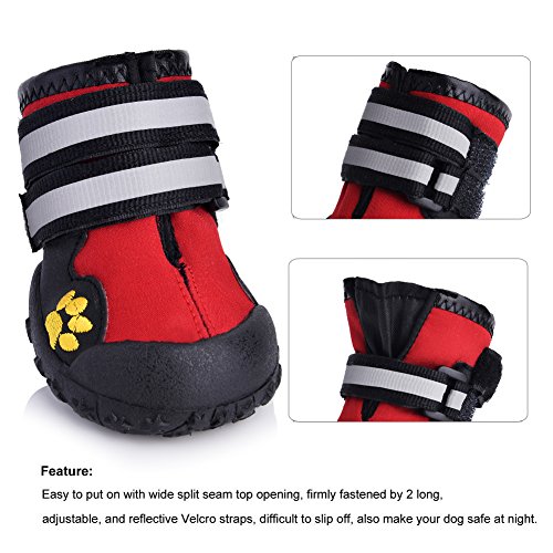 -. Feature : Easy to put on with wide split seam top opening, firmly fastened by 2 long, adjustable, and reflective Velcro straps, difficult to slip off, also make your dog safe at night. / Cute pet paw Embroidery, Fashionable yet durable, Soft and hand washable. Lightweight, soft and hand washable, practical for dogs or puppies in daily walks during spring, summer, and early fall. / Let your dog stand up and place your dogs paw on a blank piece of paper. For length mark from the longest toenail to the back of the paw. For width mark the widest of the paw left to right. Measure paw's width for the best fit. Refer the size chart with actual size of pet boots and choose the best suitable size for your Dog. / Size 4 is for 2.95" x 2.48"(L*W), Size 5 is for 3.15" x 2.63"(L*W), Size 6 is for 3.35" x 2.87"(L*W), Size 7 is for 3.74" x 3.03"(L*W), Size 8 is for 3.94" x 3.23"(L*W). / Made of tough, water resistant material, Flexible, skid-resistant and waterproof sturdy soles, capable to keep debris out. Not only bring more comfort and keep your love dog clean when they running outside. But also keep their paws warm and walking on snow safety in winter.