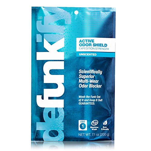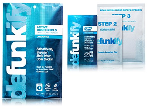 Studio : Defunkify Publisher : Defunkify Binding : Misc. Product Description Defunkify's Active Odor Shield treatment kit is perfect for those who like to explore the world away from modern conveniences - like washing machines. Garments treated with our anti-odor shield resists stink so well you can wear your performance gear multiple days in a row without smelling funky. It's perfect for that hike, long ride or camping trip. First, our Active Wash super detergent (included) removes stains, sweat, body oils and the built-up scum that cause persistent odor. Then the Active Odor Shield coats the fibers with deodorizing molecules to prevent odor during and after wear. Just one treatment is so durable it will hold up through 20 washes - an entire season. We have gone through a rebranding and have updated packaging and brand name from deFUNKit to Defunkify - please note that the packaging may vary until all inventory of the old packaging is sold out. 0