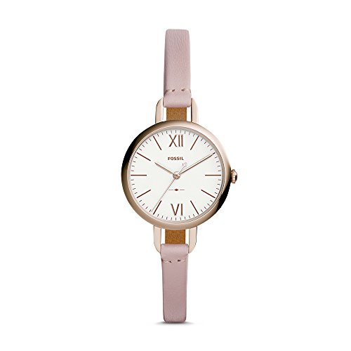 Watch Sizing Guide Redefine your look in this sleek Fossil® Annette watch. Stainless steel case. Slim leather strap with adjustable buckle closure. Round face. Three-hand analog display with quartz movement. Dial features rose gold-tone hands and hour markers, minute track, and Fossil detailing. Water resistant. Display case included. Imported. Measurements: Case Height: 28 1⁄5 mm Case Width: 29 1⁄2 mm Case Depth: 8 mm Band Width: 7 1⁄10 mm Band Circumference/Length: 8 3⁄4 in Weight: 1 oz This product may have a manufacturer's warranty. Please visit the manufacturer's website or contact us at warranty@support.zappos.com for full manufacturer warranty details.Feature