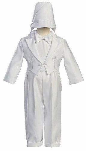 Very dapper! This beautiful baby boy's tuxedo includes rounded tail jacket, pants, shirt, bowtie and cap. Front of jacket is embroidered with crosses. Beautiful tuxedo for weddings, christening/baptism, or any special occasion.Feature