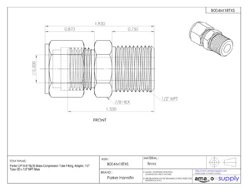 Parker CPI 8-8 FBZ-B Brass Compression Tube Fitting, Adapter, 1/2" Tube OD x 1/2" NPT Male