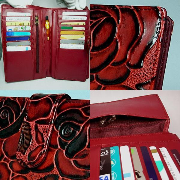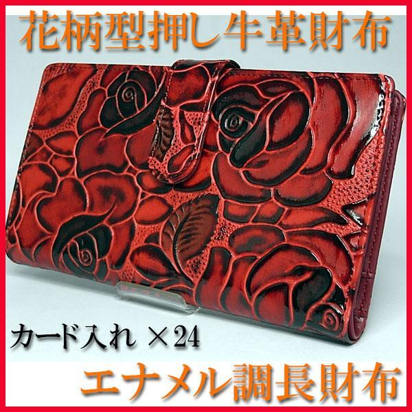 【全国宅配便送料無料】 【ラッピング無料】カード入れが24もあります!! 収納タップリ、花柄型押し長財布の登場です。 お札は折らずに入ります。 牛床革を使用しながら、部分的にエナメル調にもなっている大人デザインの財布です。ブラックを基調に型押しの薔薇が上品です。 幅広い年齢層の方におすすめ!。 箱入りなのでプレゼントにもどうぞ☆【注】バラの出方は商品ごとに異なります。写真は一例です。イメージ違いの返品はご遠慮願います。サイズ:タテ10.5cm×ヨコ18.5cm×マチ2cm素材:牛床革、(内側)合皮 仕様:カード入れ×24、ポケット×4、札入れ、ファスナーポケット、ペン差し 付属品:箱 ( バラ 薔薇 ばら 人気 激安 最安値 限定 特価 ブランド ランキング)