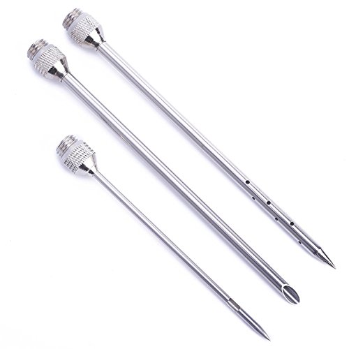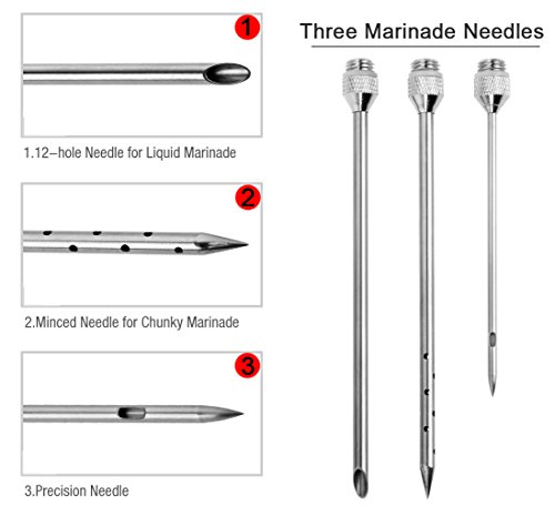 - THREE SPECIALLY DESIGNED MARINATE INJECTION NEEDLES allows for deep penetration and even distribution so every bite contains an explosion of flavor. One 6" needle is solid with an angled cut while the other 6" needle contains 12 holes. The 12 hole needle is for liquid marinades and the wide tip needle is for chunky marinades. The third needle is 3" and is for a more precision injection and for smaller cuts of meat.