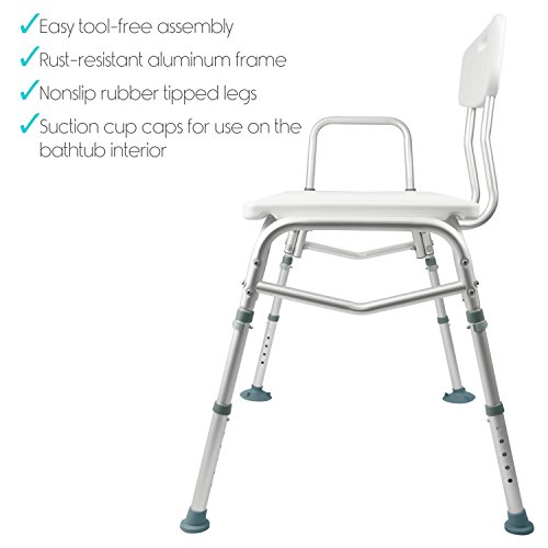 REVERSIBLE DESIGN FOR ANY BATHROOM: Lightweight and durable, the arm and backrest are reversible to accommodate any tub or shower. The bench is 30.5” wide at the base and the dual column extension legs adjust to a maximum of 23.5” high for personal comfort. Corrosion-resistant, the frame and platform seat are easily cleaned with a standard disinfectant.
