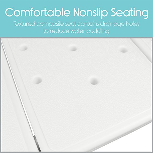 COMFORTABLE AND SECURE SEATING: Feel secure and stable with the non-skid, non-slip bench. Each outside leg is capped with a non-skid, non-slip tip for a safe and secure experience. Large suction cup caps on the interior legs ensures the bench does not slip or slide on the smooth tub surface. Providing additional comfort and security, the molded plastic seat contains 30 drainage holes to prevent the puddling of water on the seat.