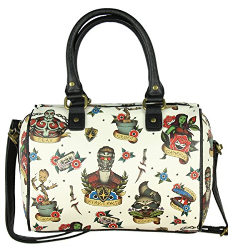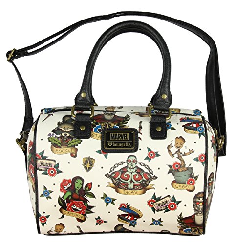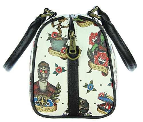 Studio : Loungefly Publisher : Loungefly Product Description Officially licensed Guardians of the Galaxy faux leather duffle cross body bag. Featuring a Star-Lord, Gamora, Drax, Baby Groot, Rocket Raccoon Tattoo All Over Print. Zipper top closure, interior zipper pocket, interior open slip pocket, and removable cross body shoulder strap. 0
