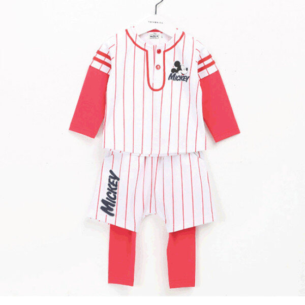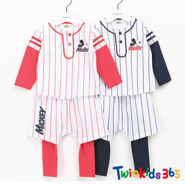 전체 핀 스트라이프 패턴이 들어가는 상하로 앞가슴 단짝 테잎 장식으로 리얼 야구 유니폼 느낌을 냄 ,하의는 배기 반바지 레이어드 팬츠로 세트 구성됨
