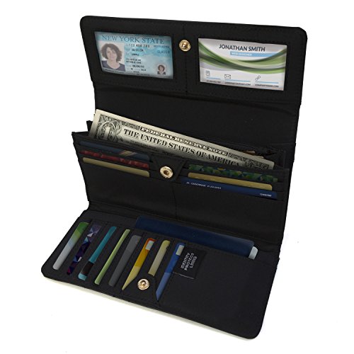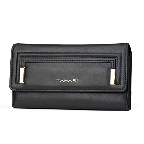 -. Feature : WOMENS RFID WALLET BLOCKING TECHNOLOGY - This TAHARI RFID blocking wallet clutch stops theft and electronic pick pocketing, protect your credit cards, debit cards, drivers license, bank cards or any other RFID enabled cards / BEAUTIFULLY DESIGNED WOMENS WALLET CLUTCH - A stylish vegan leather pattern with a snap closure and gold bar hardware features: 14 credit card pockets, 2 large pockets, 2 interior Picture Photo / ID window / INTERIOR ACCORDION FILING SYSTEM HOLD YOUR SMART PHONE - There are 2 gusseted compartments perfect for coupons, receipts, cash or checkbook plus a zippered pocket for small valuable items plus the interior pockets are great to hold your smart phone / EXTRA STORAGE 2 ZIPPER POCKETS - Inside this womens clutch there is a zipper pocket as well as on the back of this womens clutch there is a zippered coin pocket to keep your loose change and coins / STOP RFID IDENTITY THEFT RFID PASSPORT WALLET - Blocks scanners and readers from stealing your personal information helping to protect your identity and keep your information safe when you travel when using our womens RFID wallet