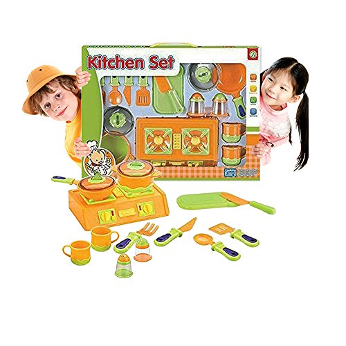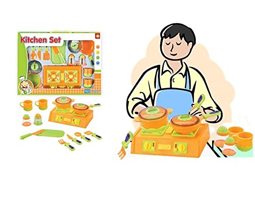 -. Feature : 15 pieces cooking ware. Includes cutlery, pepper pots and salt, two cups, two pans with lids, mini gas top, chopping board and plastic chopping knife. / Helps your child identify and learn the things around the kitchen. / Made from high quality plastic, can withstand rough handling of children, lightweight, easy to clean and safe for children. / Makes a great gifts for children. / Helps widen their imagination and creativity.