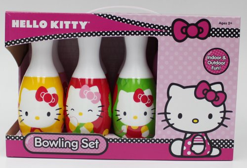 Bowling set includes 1 plastic ball and 6 plastic pins in different colors and a variety of different Hello Kitty images on each pin