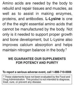 -. Feature : PROMOTES HEALTHY BONE DEVELOPMENT - L-Lysine helps your body to absorb and use calcium to grow and reinforce your bones. This critical amino acid must come from diet or supplementation. / EFFECTIVE WORKOUT RECOVERY SUPPLEMENT - Your body also uses L-Lysine in protein synthesis. Workouts cause tiny tears in your muscles and tiny bone fractures. L-Lysine helps your body to heal from these micro-injuries faster. / CERTIFIED POTENCY- Proudly made in the USA in a Good Manufacturing Practices (GMP) certified environmentally friendly facility also certified by the FDA (Food and Drug Administration) and registered with the U.S. Drug Enforcement Administration (DEA). / BPA-FREE GLASS BOTTLES - Designed for quality, purity and potency, our supplements are sealed in amber glass bottles with best-by dates and heat-sealed sleeves. Each bottle contains 50 easy to swallow gluten free and vegan L-Lysine capsules. / TRUSTED BY AMAZON SHOPPERS - Natural Nutra has a 99%+ positive feedback rating because of our commitment to total customer satisfaction. If anything is wrong with your order, we'll make it right or you can return your supplement within 30 days for a full refund.