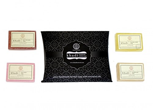 Pack Contains : Khadi Pure Lavender Soap : The Lavender Soap Cleanses The Skin And Body Dirt While Exfoliating Dead Cells From The Body And Give A Soft & Smooth Feeling. The Fragrance Of Lavender Helps To Relax And Is Especially Beneficial For Anxiety. Khadi Chandan-Haldi Soap : Khadi Chandan And Haldi Bathing Bar Protects From Bacteria. It Gives Freshness & Coolness To The Body Khadi Rose Water Soap : A Unique Recipe Using Rose Petals Water And Glycerine. Khadi'S Rosewater Soap Impart Mild Antiseptic Properties While Keeping Skin Smooth And Velvety. Khadi Sandal Wood Soap : Khadi Sandalwood Soap Has Immense Healing Properties. Its Cooling, Calming And Antiseptic Properties Soothe Skin Leaving It Moisturized And Free Of Infections. Benefits : Anti AcneFeature