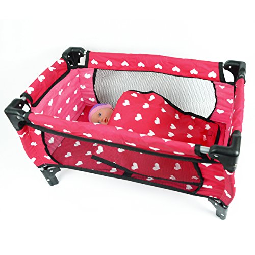 Made to fit 18 Inch dolls such as American Girl, Madame Alexander, Our Generation, etc.;Doll bed is in pretty pink with white hearts design (matching heart strollers, furniture, doll carrier backpack, 18 doll suitcases plus more accessories);Doll Pack n play folds up neatly and has zip up storage bag;Doll playpen has strong metal frame;Made by The New York Doll Collection, offering the highest quality 18 Doll Strollers, 18 Doll Furniture, 18 Doll Clothes, 18 Doll Shoes and 18 Doll Accessories!Feature