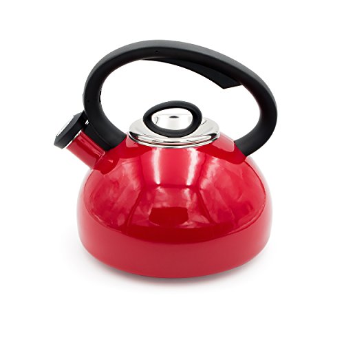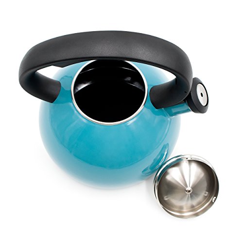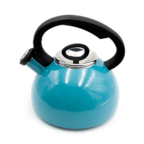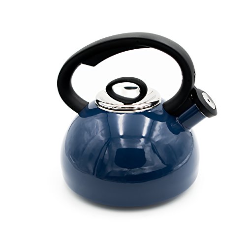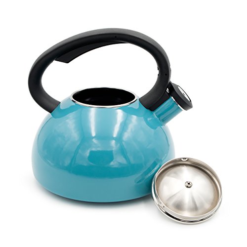 2 quart capacity enamel-coated on steel tea kettle heats up quickly and retains heat well. Beautiful and durable construction guarantees not to fade and easy for clean-up.