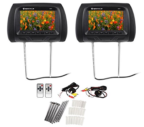 -. Feature : 7" Black High Resolution Car Headrest Monitor with Speakers and IR Transmitter. 7" High Resolution Pair of Monitors. Universal - Fits Virtually All Vehicles. Easy Installation - Everything is Included (Step by step install guide included). 480 x 234 High Screen Resolution. 16:9 (Wide Screen) or 4:3 (Letterbox) Switchable Aspect Ratio. 300:1 Contrast Ratio. Bright Backlit Display. Adjustable picture, brightness, contrast, volume. / PAL/NTSC Auto Switching. IR Transmitter for IR Compatible Stereo Headphones (Sold Separately). Internal Stereo Speakers. Requires External A/V Source Such as In-Dash DVD Player. RCA A/V Output. Adjustable and Detachable Metal Poles (4.3in - 7.5in). Plastic Inserts for Custom Fit to Most Vehicles. Forward/Backwards Tilting Headrest. / On Screen Display Menu In English, Spanish, French, Russain, Chinese, Italian, Portugese, German, Dutch. (2) Multifunction Remote Controls Included. Color: Black (Also available in Grey and Tan). Power on/off. DC 12V Power Supply. Dimensions (HxWxD) 7.3" x 10.8" x 5.3". Height with poles 13.4". / Two matching headrest are included. The colors are made to match the color of your interior. We make these in black, grey, and beige. Image quality is at an amazing 400 x 234 resolution. The picture is crystal clear. All Rockville video products go through an extensive testing phase before production. We take a sample unit and keep it on for days straight (24 hours a day) and ensure that the picture stays crystal clear even after the monitor being on for long periods of time. / The built-in screens on the headrests can tilt forward and backwards for best viewing angles. There are also RCA audio/video output connections for video output to additional monitors in your system. There are internal speakers built into each headrest which allows for lower volume listening, so you do not disturb passengers in the front. You can also connect wireless IR headphones since this has a built in IR transmitter.