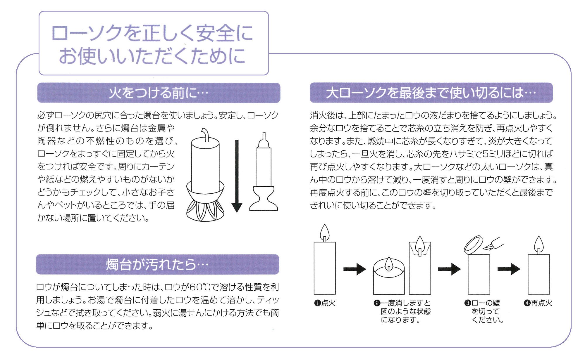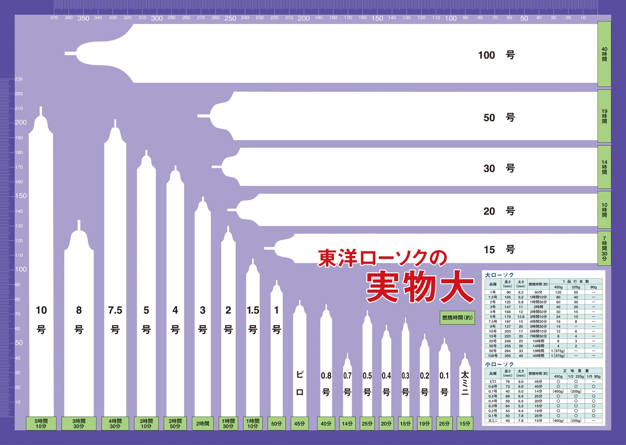 Size per one: Approximately diameter 17 x 203 mm Burning time: About 5 hours 10 minutes Be sure to use the lampstand that matches the size of the candle and do not leave your side while burning.