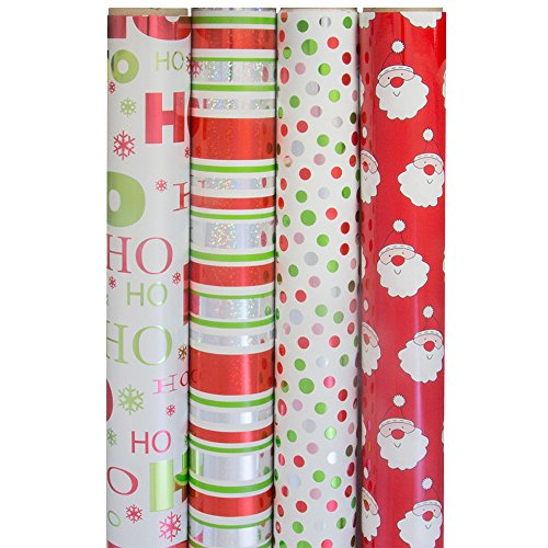 Studio : JAM Paper Envelope Publisher : JAM Paper Envelope Binding : Office Product Product Description JAM Paper® Classic Christmas Christmas Design Wrapping Paper Set contains 4 rolls of holiday themed and festive wrapping paper! Each roll of gift wrap in this set contains 45 square feet. This means that there is a cumulative total of 180 square feet of gift wrap in the whole set! The paper on the first roll in this set features a white color and a pattern of the words "Ho Ho Ho" written in various shiny red and green fonts. The paper on the second roll features a pattern of shiny red, green, white and silver horizontal stripes. On the third roll, there is a white gift wrap featuring a pattern of red, green, and silver polka dots. The paper on the fourth roll is red and features a pattern of smiling cartoon Santa faces. Use this bright gift wrapping paper set to add a touch of fun to all of your gifts this holiday season! Size: 180 Sq. Ft. | Color: Classic Christmas | Quantity: 4/pack 0