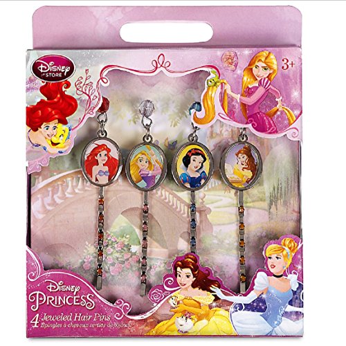 Set includes four hair pins: Rapunzel, Ariel, Snow White, and Belle Cloisonne pin toppers Pin toppers feature attached jewel Pin stems feature colored rhinestones Ages 3+ Metal / plastic 2 1/4'' L Imported