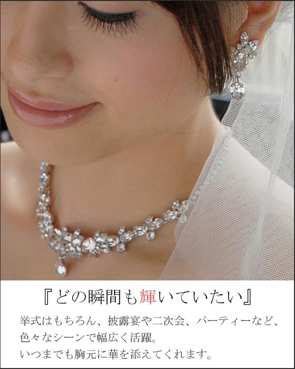 1点の曇りがない透明感あるきらめきが美しい、 ウエディングドレスのデザインを選ばず、コーディネートしやすいウエディングネックレスです。