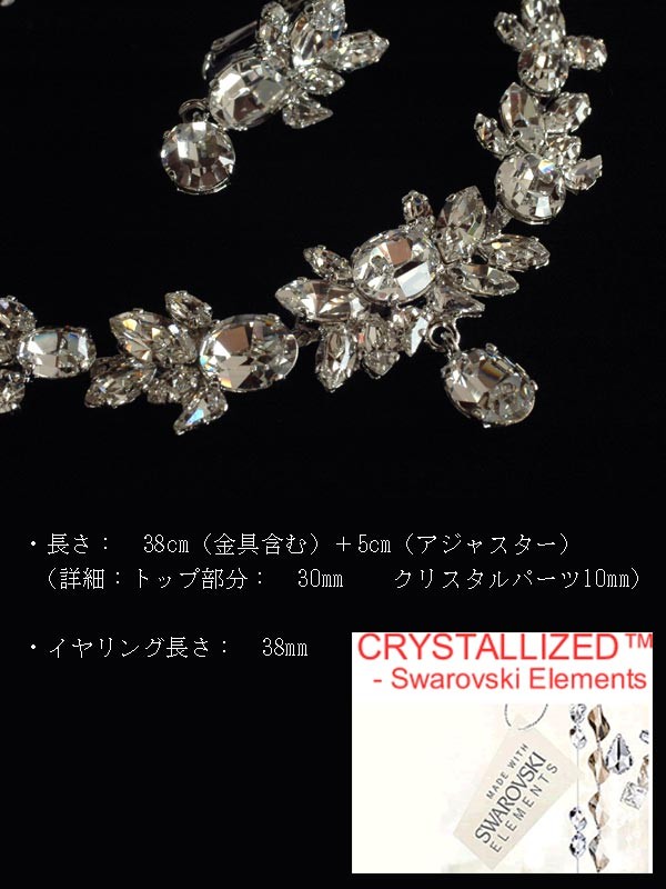 ・長さ: 38cm(金具含む)+5cm(アジャスター) (詳細:トップ部分: 30mm クリスタルパーツ10mm) ・イヤリング長さ: 38mm |