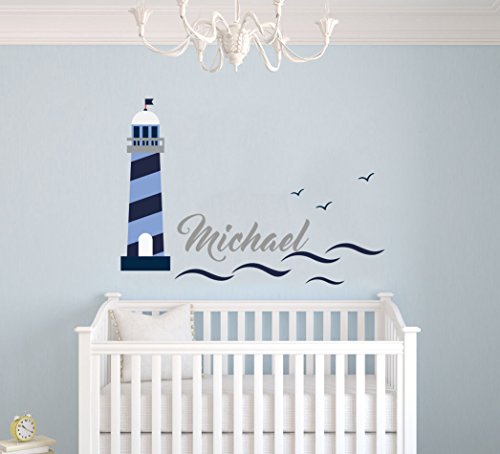 Custom Name Lighthouse Waves Birds Animal Series - Nautical Theme - Baby Boy - Wall Decal Nursery For Home Bedroom Children (MM) (Wide 22"x15" Height)