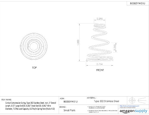 Conical Compression Spring, Type 302 Stainless Steel, Inch, 1" Overall Length, 0.72" Large End OD, 0.281" Small End OD, 0.042" Wire Diameter, 7.67lbs Load Capacity, 8.37lbs/in Spring Rate (Pack of 10)