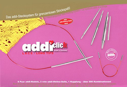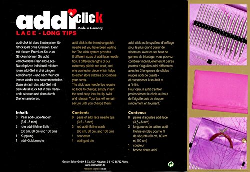 - Each addi Click Lace Long set includes 8 different sizes of addi Lace Long tips US 4, 6, 7, 8, 9, 10, 10.75, 11; Metric 3.5, 4.0, 4.5, 5.0, 5.5, 6.0, 7.0, 8.0mm; includes 3 extremely pliable RED cords which create needles sizes US 24in., 32in., 40in.; Metric 60, 80, 100cm