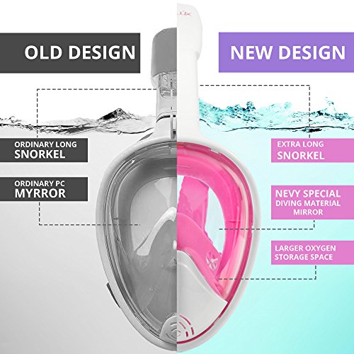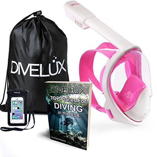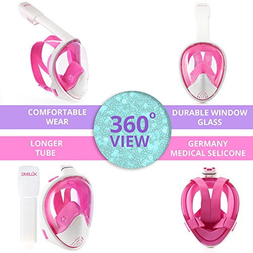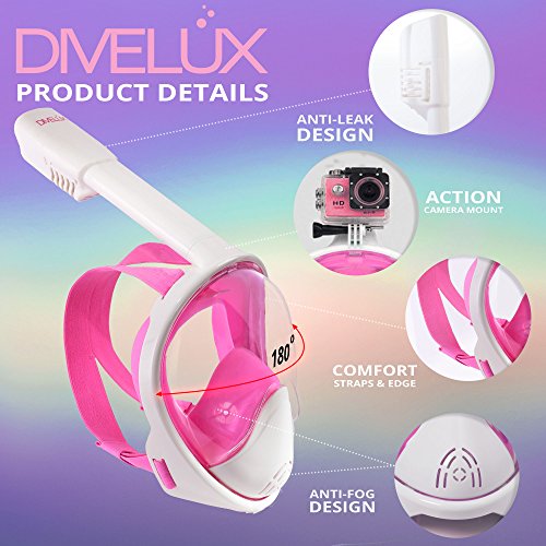 DIVELUX Snorkel Mask - Full Face Snorkeling and Diving Mask with 180° Panoramic Viewing - Longer Ventilation Pipe, Watertight, Anti Fog & Anti Leak Technology, S/M, L/XL (Pink, L/XL)