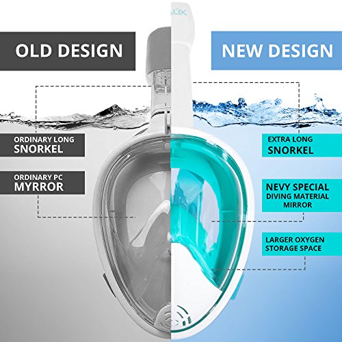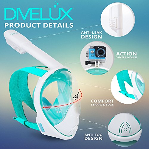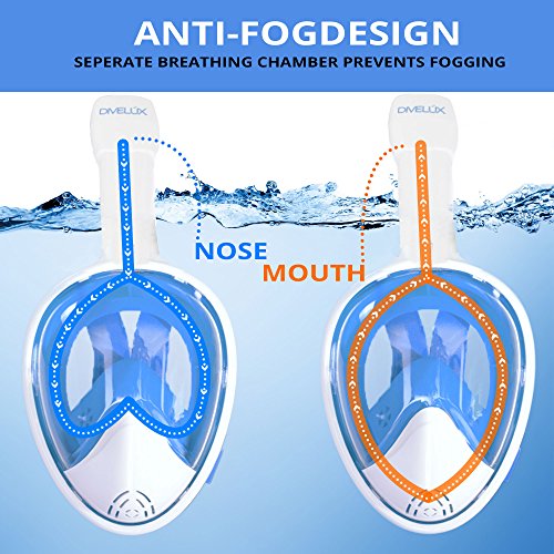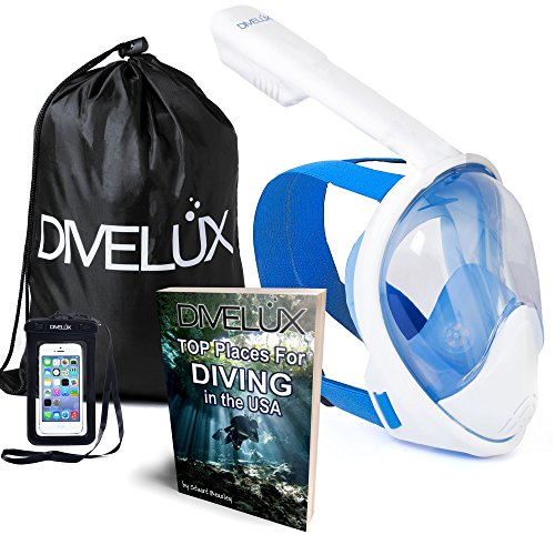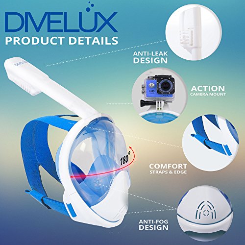 DIVELUX Snorkel Mask - Full Face Snorkeling and Diving Mask with 180° Panoramic Viewing - Longer Ventilation Pipe, Watertight, Anti Fog & Anti Leak Technology, S/M, L/XL (Blue, L/XL)