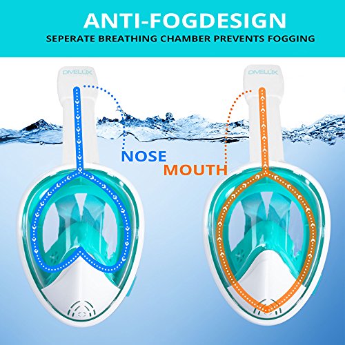 DIVELUX Snorkel Mask - Full Face Snorkeling and Diving Mask with 180° Panoramic Viewing - Longer Ventilation Pipe, Watertight, Anti Fog & Anti Leak Technology, S/M, L/XL (Green, S/M)