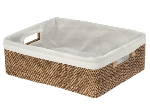 Woven by hand from natural rattan, this honey-brown shelf basket offers ample storage space while displaying a unified, streamlined appearance. Use to show off decorative accents, organize mail, books or magazines, or corral unsightly clutter to create a coordinating, clean look. A cotton liner in an off-white hue softens the look and offers protection for delicate contents, while durable handles offer easy portability.