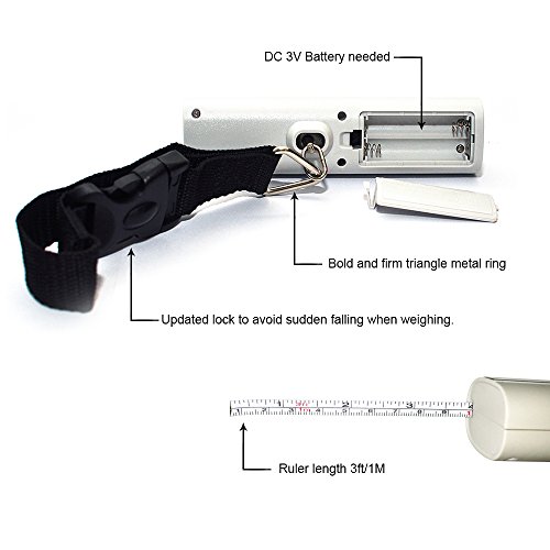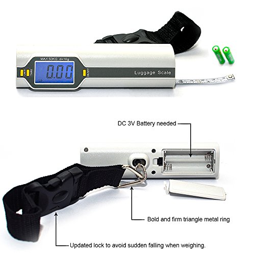 Never Pay Unexpected Overweight Bag Fees Again after you get this Mini Weight Scale. ?Have you ever -found it so difficult to weigh your luggage on the body scale? -Felt embarrassed to open your well-packed bags and move items at the airport checking counter? -Been caught with up to $200 unexpected overweight charges when you were hurried for a plane? This Mini Luggage Scale is the best choice for you and your friends. 1. This Luggage Weight Scale is the updated model in the market. It is with firm lock on the belt. Max capacity is 50 Kilos grams. 2.This Mini Luggage Weight scale is with Multi -Unit Display. It can transfer with KG, OZ, JIN, LB. 3. This light digital travel luggage scale is portable at your luggage and your pocket. Very easy to bring it everywhere. 4. This travel easy electronic luggage scales can help you and your friends to save time before check in airport. 5. This digital portable travel luggage scale can show you the detail weight even at dark night. 6. This Mini Weighing Scale is with Auto Zero and Auto Off function. 7. The digital portable travel luggage scale is also with Tare function. 8. The Luggage weighing scale is with measure ruler on it. It is also very usful in home daily life.?? 8. This digital travel scales valid date is 6 years. Life time warranty. 9. Specifications *Capacity: 110lb (50kg) *Graduation: 0.1lb (50g) *Battery: 2 AAA DC 3V battery (Needed) *Large and Blue Backlight LCD display *CE/FCC/ROHS Approved