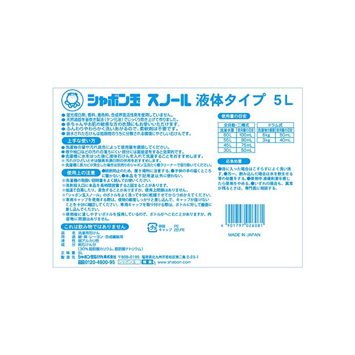 원본상품명: 【大容量】 シャボン玉 衣料用液?洗? スノ?ル 5L