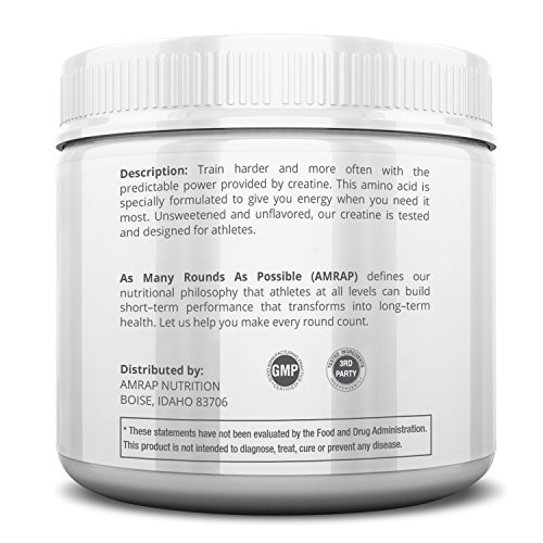 -. Feature : ADVANCED FUEL FOR PREDICTABLE POWER: Creatine is a naturally occurring acid that's essential in the process of sending energy directly to the muscles. AMRAP Nutrition Pure Creatine is formulated to quickly deliver the energy you need to power through workouts and train harder and more often. / INCREASES LEAN MUSCLE MASS: When used as a preworkout, AMRAP Nutrition Pure Creatine provides fuel to your muscles that allows you to work harder and longer. The result is more lean muscle mass in a shorter period of time and quicker recovery between sessions. / SOURCED FOR QUALITY & PURITY: Each scoop of AMRAP creatine contains 5,000mg of pure creatine monohydrate, manufactured in Germany under rigorous controls to ensure the highest quality for maximum effectiveness. / THIRD-PARTY TESTED: All AMRAP Nutrition products are independently third-party tested for purity, safety, and nutritional value. Documentation is available on AMRAP Nutrition's website. / GUARANTEE: If you're dissatisfied with this product for any reason, you may return it within 90 days for a full refund. No questions asked.