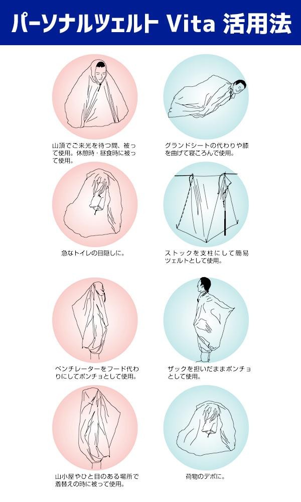 | 軽量でコンパクト、様々な用途に使えるパーソナルツェルトです。休憩や急なトイレの目隠しに。ベンチレーターをフード代わりにしてポンチョに。紐で吊り下げて簡易ツェルトに。 |