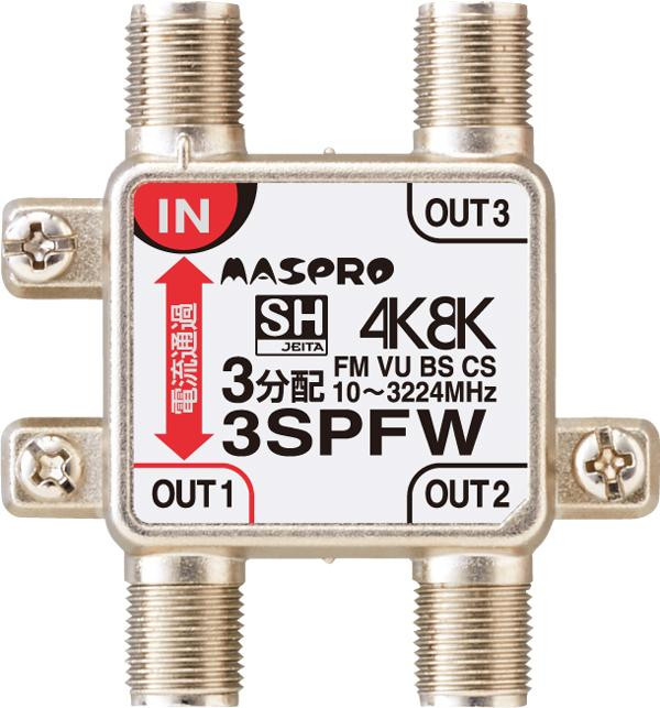 4K・8K衛星放送(3224MHz)に対応、地デジ・BS・CS分配器(1端子電流通過型3分配器)です。