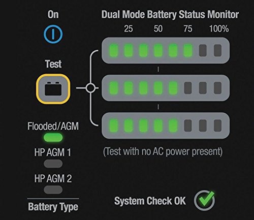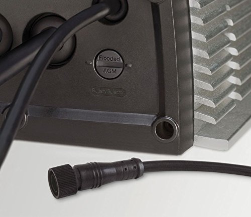 Intuitive LED display with charge mode indicators and real time charge level status with an on-the-water push-to-test feature for percent of battery power remaining