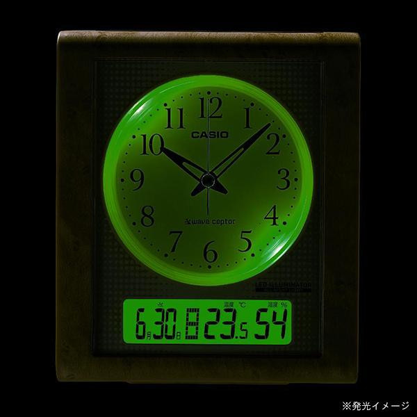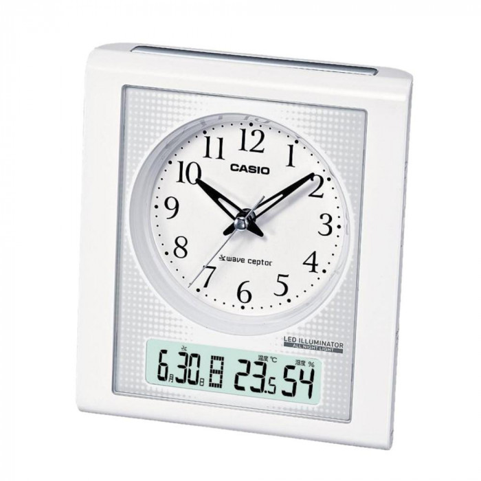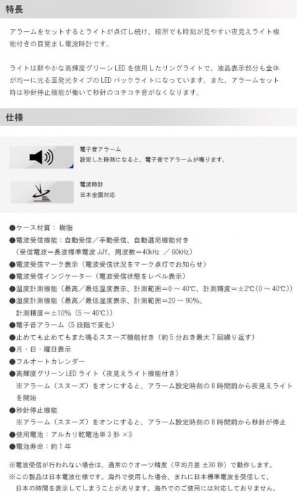 | アラームをセットするとライトが点灯し続け、暗所でも時刻が見やすい夜見えライト機能付きの目覚まし電波時計です。ライトは鮮やかな高輝度グリーンLEDを使用したリングライトで、液晶表示部分も全体が均一に光る面発光タイプのLEDバックライトになっています。また、アラームセット時は秒針停止機能が働いて秒針のコチコチ音がなくなります。 |