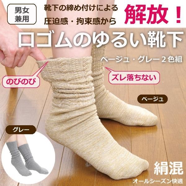 | 口ゴムが良く伸び、締め付けによる足の疲労感を防ぎます。肌にやさしい絹混で、オールシーズン快適に使用できる靴下です。脱ぎやすく履きやすいので、腰痛持ちの方や介護用としても最適です。 |