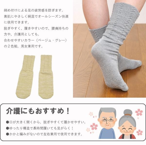 口ゴムが良く伸び、締め付けによる足の疲労感を防ぎます。肌にやさしい絹混で、オールシーズン快適に使用できる靴下です。脱ぎやすく履きやすいので、腰痛持ちの方や介護用としても最適です。 |