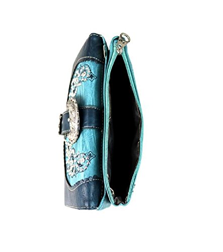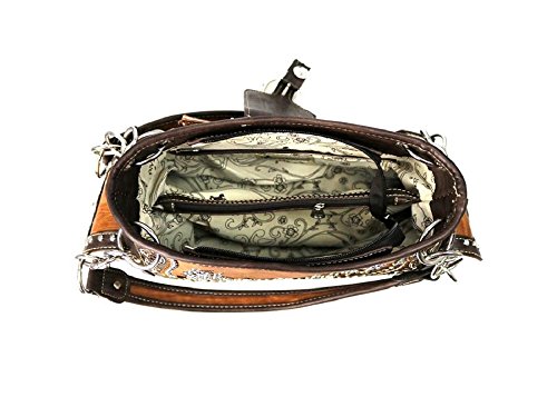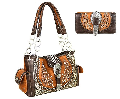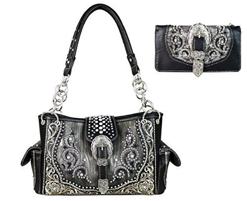 Product Description Montana West purse features zipper and magnetic closure, center zipper compartment, studs, inside zipper and open pocket, back concealed pocket approx. 9.5" x 5.5" and open pocket on back, metal feet, double chain handle drop approx. 10" and measures approx. 13" x 8" x 5". Also includes matching secretary wallet. 0
