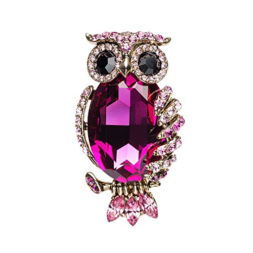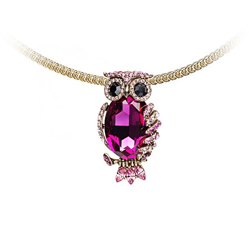 Swarovski Owl Necklace Fuschia The owl's wisdom and peaceful spirit are expressed beautifully in this stunning piece. This mini-masterpiece is a perfect example of design, innovation, and craftsmanship. Sparkling in a feminine combination of fuschia, light rose Swarovski crystals, it hangs on a silver chain and adds a feminine touch to any outfit. Description : Main Crystals and Material: Swarovski Elements Crystal fuschia, light rose, Alloy Plating: Antiqued Gold Plated Chain: Omega type, Nickel Free Feature: It can be worn as a brooch Vertical length: 5 cm/2 inFeature