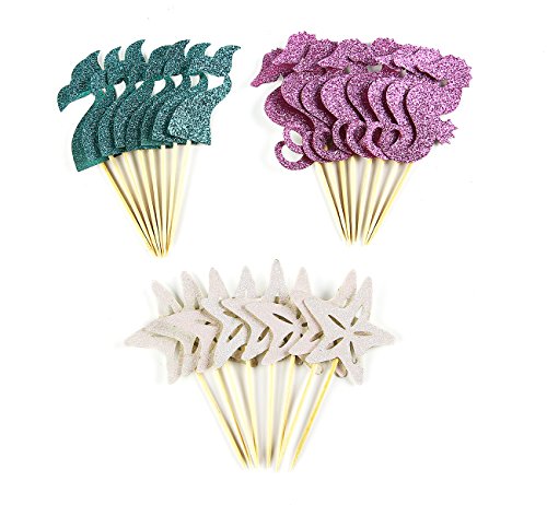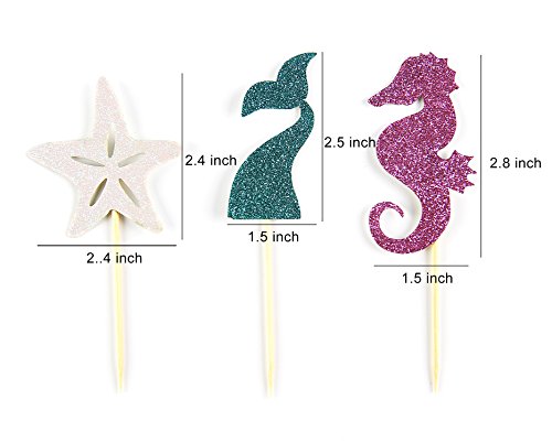 24 Pieces Mermaid Theme Glitter Cupcake Topper Cake Picks Decoration for Baby Shower Birthday Party Favors, Mermaid Tail, Seahorse and Starfish Food Picks
