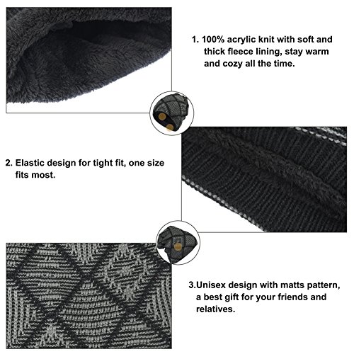 Information This unisex warm knitted beanie cap is suitable for winter and fall, which aims to keep you warm and cozy with 100% acrylic knit and soft fleece lining. This thick skull cap is versatile, which is great for stopping kids from getting sick on cold playground, keeping your noggin warm while you are biking or skating. It helps you command mosh pits at intense underground metal shows. This fashionable knitted cap will amazingly highlight your personality! Feature Material: 100% acrylic knit fleece lining Type: beanie cap, knitted cap, skull cap and ski cap Stylish: Euramerican Gender: unisex Recommend age: adult Pattern: matts Season: fall winter Size: 10.6"(depth); 9.8"(width) Package list 1*unisex knitted skull cap Notice * The actual color may vary slightly from the online image due to monitor color settings. * Please allow slight measurement deviation for the data. 0