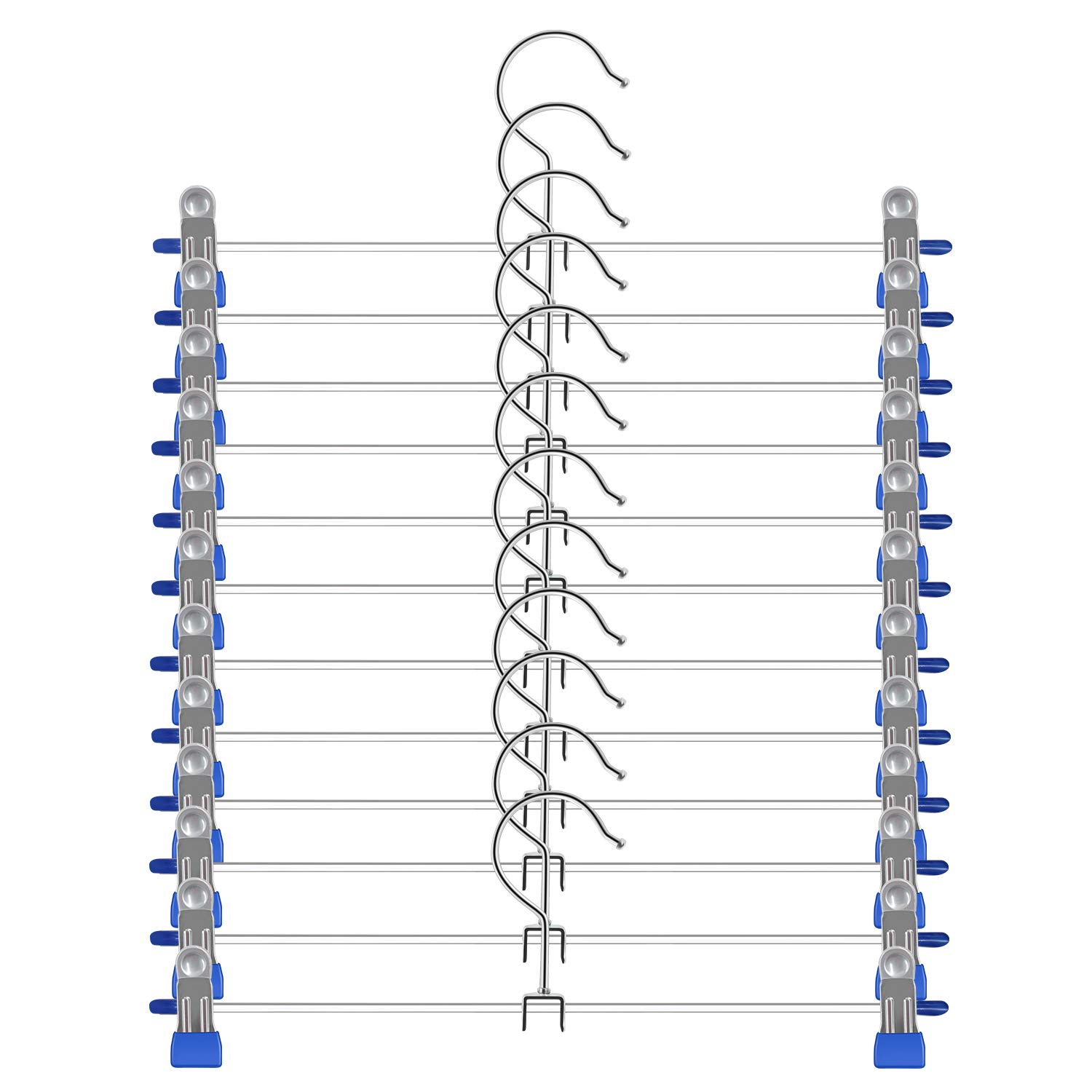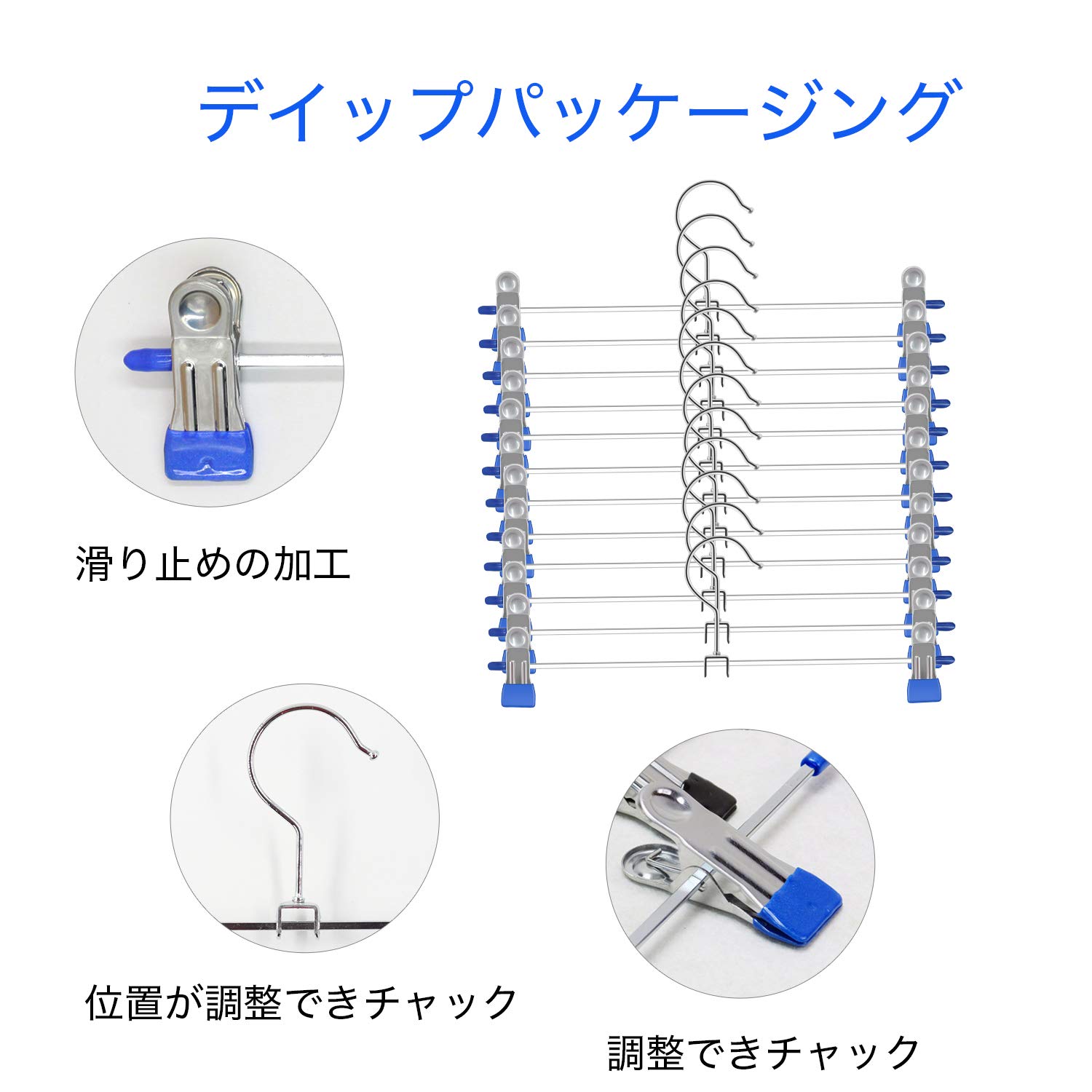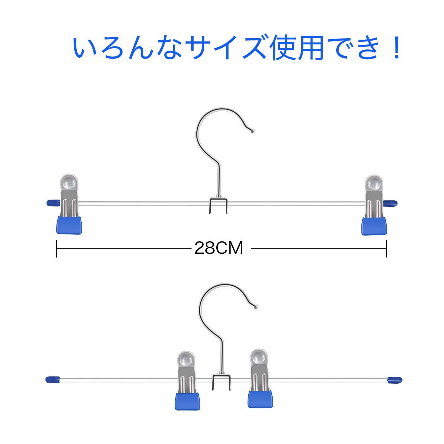調整可能・多用途ズボンハンガー :クリップが左右に動けて、間隔を自由に調節できるので、超便利ズボンハンガー です。スカート、ズボンなど様々な用途に適するだけではなく、スカートやズボンをクリップするのも、マフラーやスカーフなどにも適しています。タオルや布巾をクリップすればキッチン周りでも大活躍です。とてもコンパクトで、スカーフ、マフラーなどを吊るして収納するのに大変重宝します。