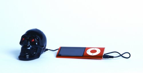 -. Feature : Eery black skull speaker / Eyes glow red when in use / Compatible with any device with a standard 3.5mm headphone socket / Requires USB port for charging / Measures 2.7 by 2.36 by 1.9-inches