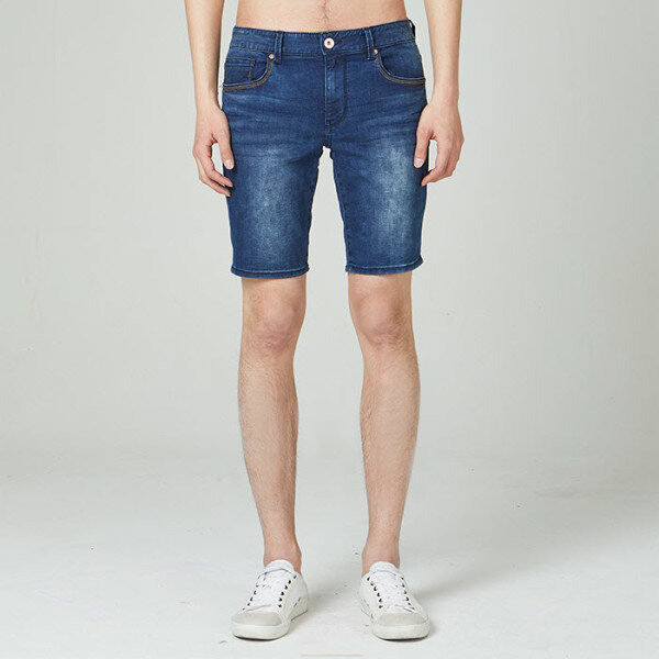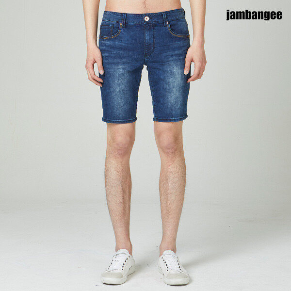 흡습성이 뛰어나 땀을 빨리 배출시켜 시원함을 느낄 수 있는 쿨맥스 소재로 세줄스티치 포인트의 DB톤 엠보 얼룩이 워싱에 남성용 4부 데님 스타일.