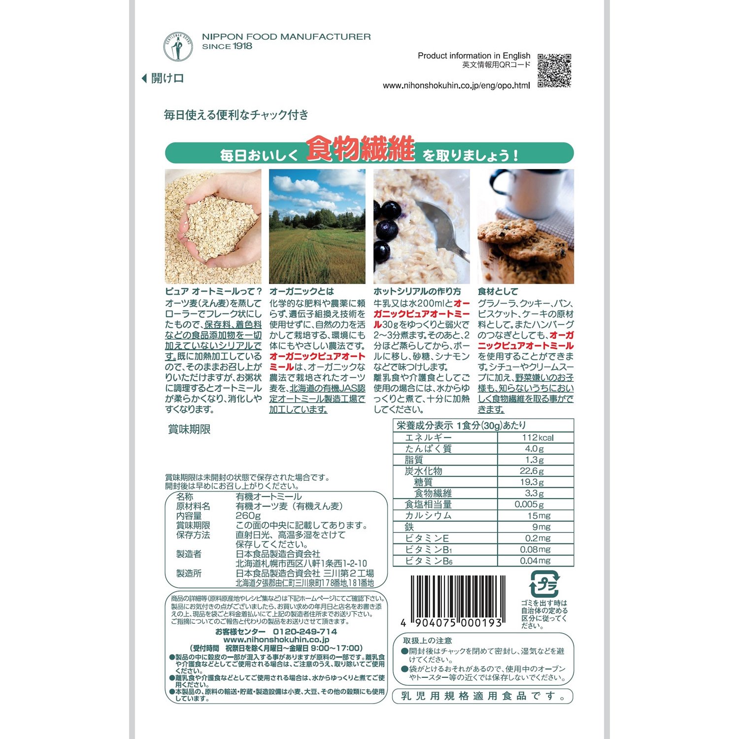 Oatmeal using only organic-cultivated oats.
